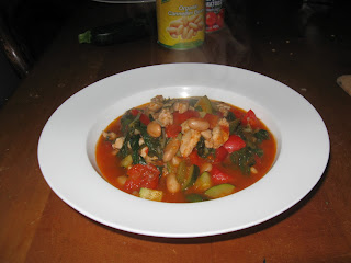 Dinner... All that talk of exercise has me thinking food again. I followed the link for balsamic chicken and white bean salad and ended up quite accidentally at a recipe for greek bean and silverbeet stew which I can't seem to make a link to... Damn technology. But here's a picture of the one I made. I added chicken thighs to the recipe as it didn't seem to have enough protein to pass muster otherwise.